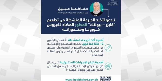ودعت الدكتورة فاطمة حبيل إلى المبادرة لأخذ الجرعة المنشطة من تطعيم “فايزر – بيونتك” المطور المضاد لفيروس كورونا والمتحورات الجديدة منه، حمايةً لأفراد المجتمع عبر التوجه مباشرة إلى مراكز الرعاية الصحية الأولية دون الحاجة إلى التسجيل المسبق.