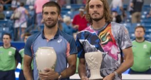 واشنطن في 21 أغسطس / بنا / تأهل اليوناني “ستيفانوس تيتيباس” الى نهائي بطولة “سينسناتي المفتوحة للتنس”، بعد فوزه المثير على الروسي “دانييل ميدفيديف” بمجموعتين دون مقابل في الدور نصف النهائي. ونجح “تيتيباس” المصنف الرابع عالميًا في اقصاء “ميدفيديف” المصنف الاول عالميا بنتيجة 7-6 و3-6 و6-3، ليضرب موعدًا مع الكرواتي …